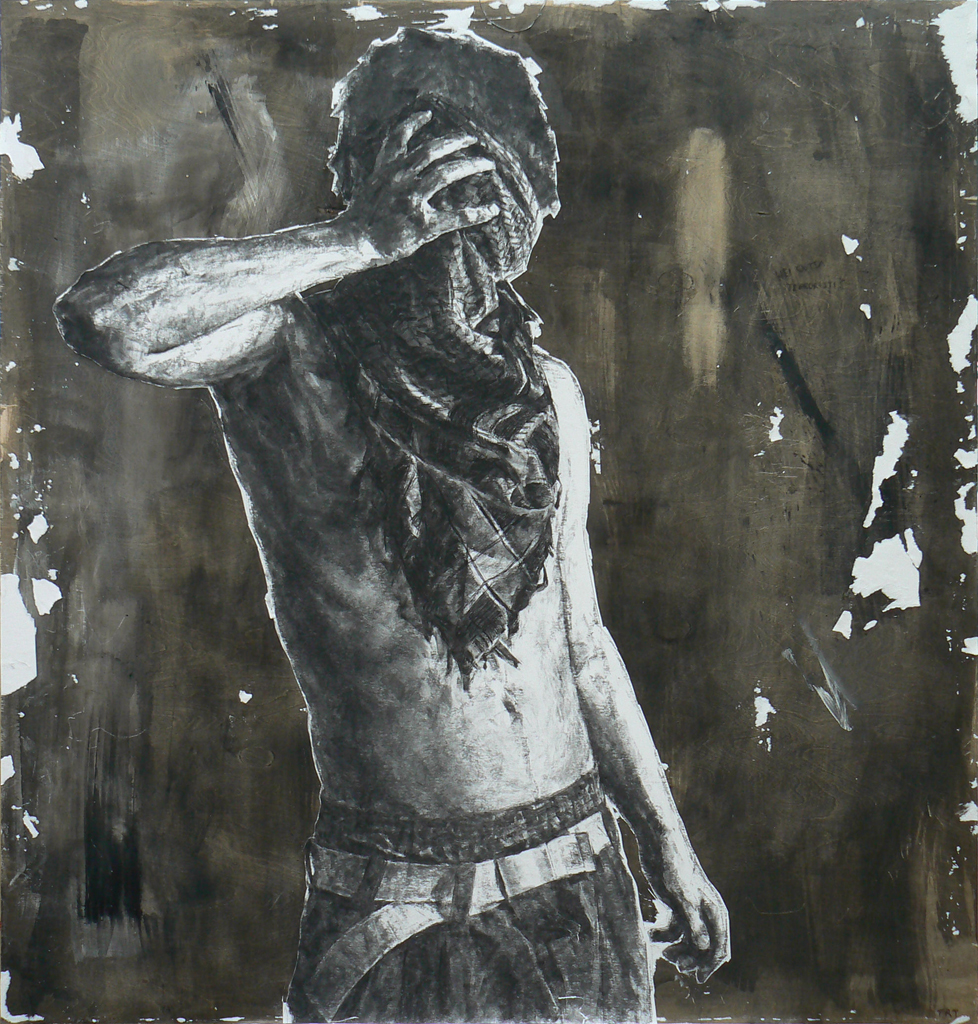 “Hey, are you a terrorist?” 2010, hiili, muste, paperi, puu – charcoal, ink, paper, wood, 120cm x 114cm
